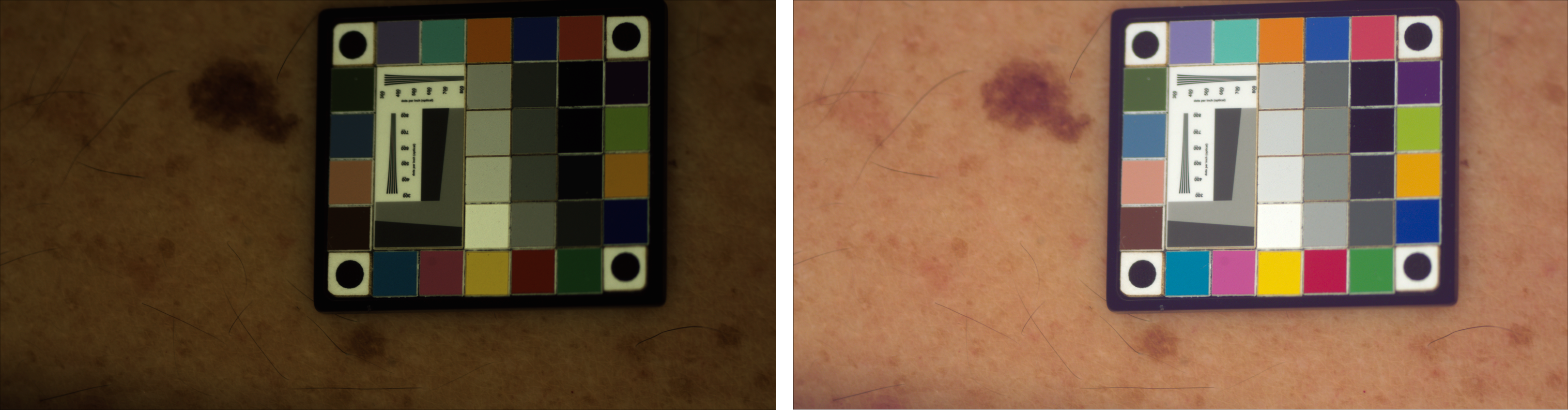 Fig. 1 An example of image calibration using a Colour Checker. Left: original RAW image. Right: colour corrected image.