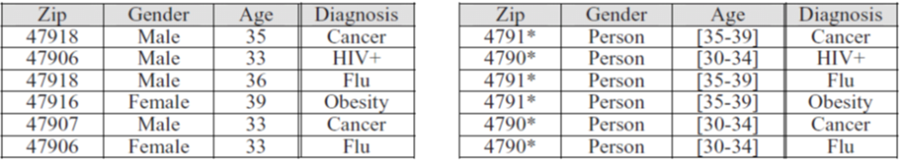 Figure 1 exemplifies the process of generalization of the zip, gender and age data attributes (in the left table). The resulting data set (right table) is k-anonymized (for zip, gender and age) where each patient can’t be distinguished from at least other 2 patients (k=3).