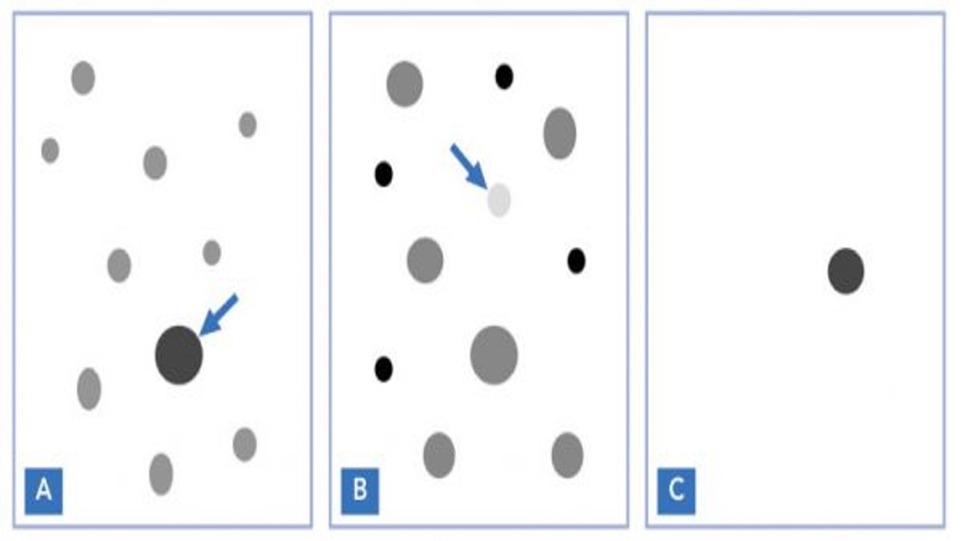 In A, the patient has one dominant mole pattern with slight variation in size. The outlier lesion is clearly darker and larger than all other moles. In B, the patient has two predominant nevus patterns, one with larger nevi and one with small, darker nevi. The outlier lesion is small but lacks pigmentation. In C, the patient shows only one lesion on the back. If this lesion is changing, symptomatic, or deemed atypical, it should be removed. Image Source [2].