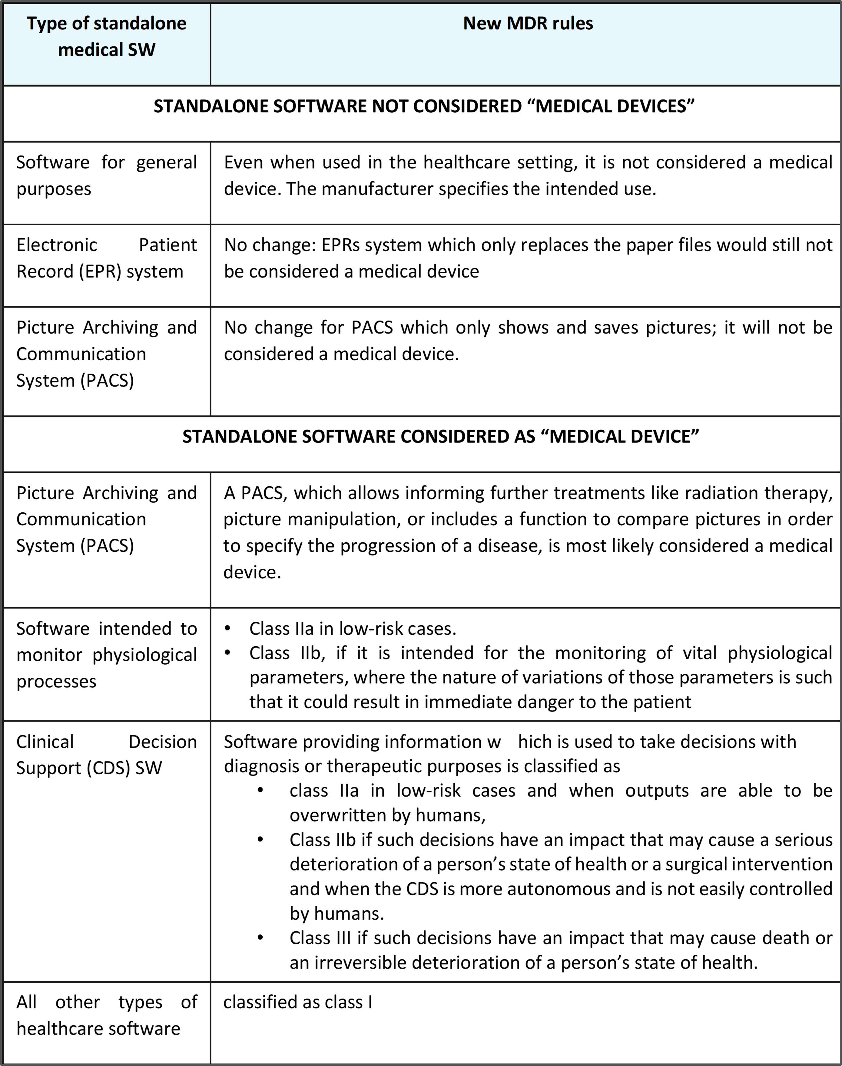 On the contrary standalone medical software are classified on their own right and here the MDR introduces significant changes compared to the MDD. The new classification rules are moved into the higher risk classes II or III, as indicated in the following table where we differentiate between standalone SW excluded by the definition of medical device and embedded SW products considered as “medical devices”.