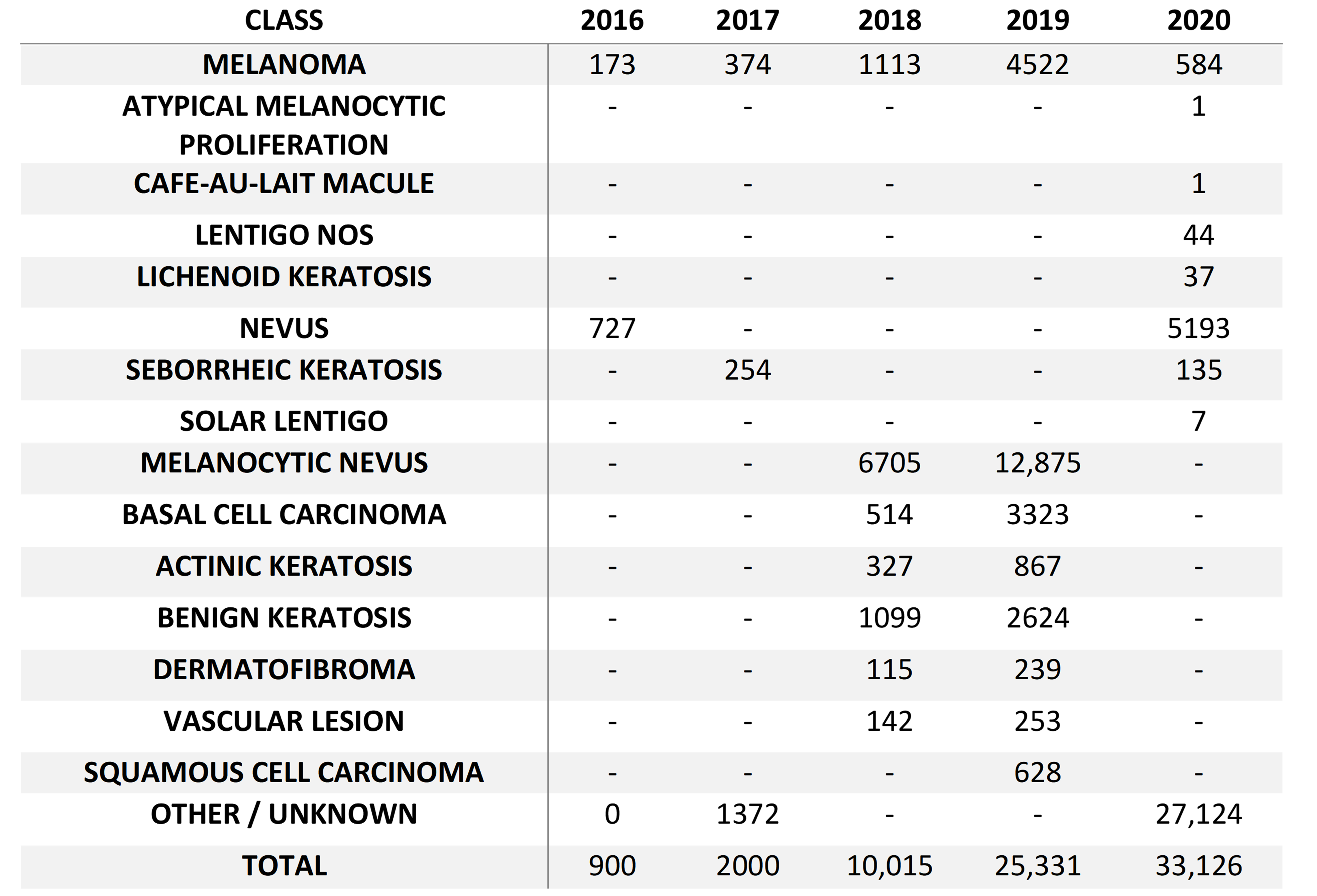 The ISIC community organizes a yearly skin lesion classification challenge and publish a dataset to attract wider participation of researchers to improve the diagnosis of Computer-aided diagnosis (CAD) algorithms and to spread awareness of the growing problem that skin cancer represents. Following table shows a summary of the number of images per lesion class within the ISIC datasets (2016–2020). We note that the number of images has increased substantially every year since its introduction and ISIC challenge used a different classification system each year starting from 2016. There are a total of 16 classes and ~71,00 images for ISIC training sets 2016 - 2020. Table shows the detailed split of class distribution for ISIC 2016 - 2020.