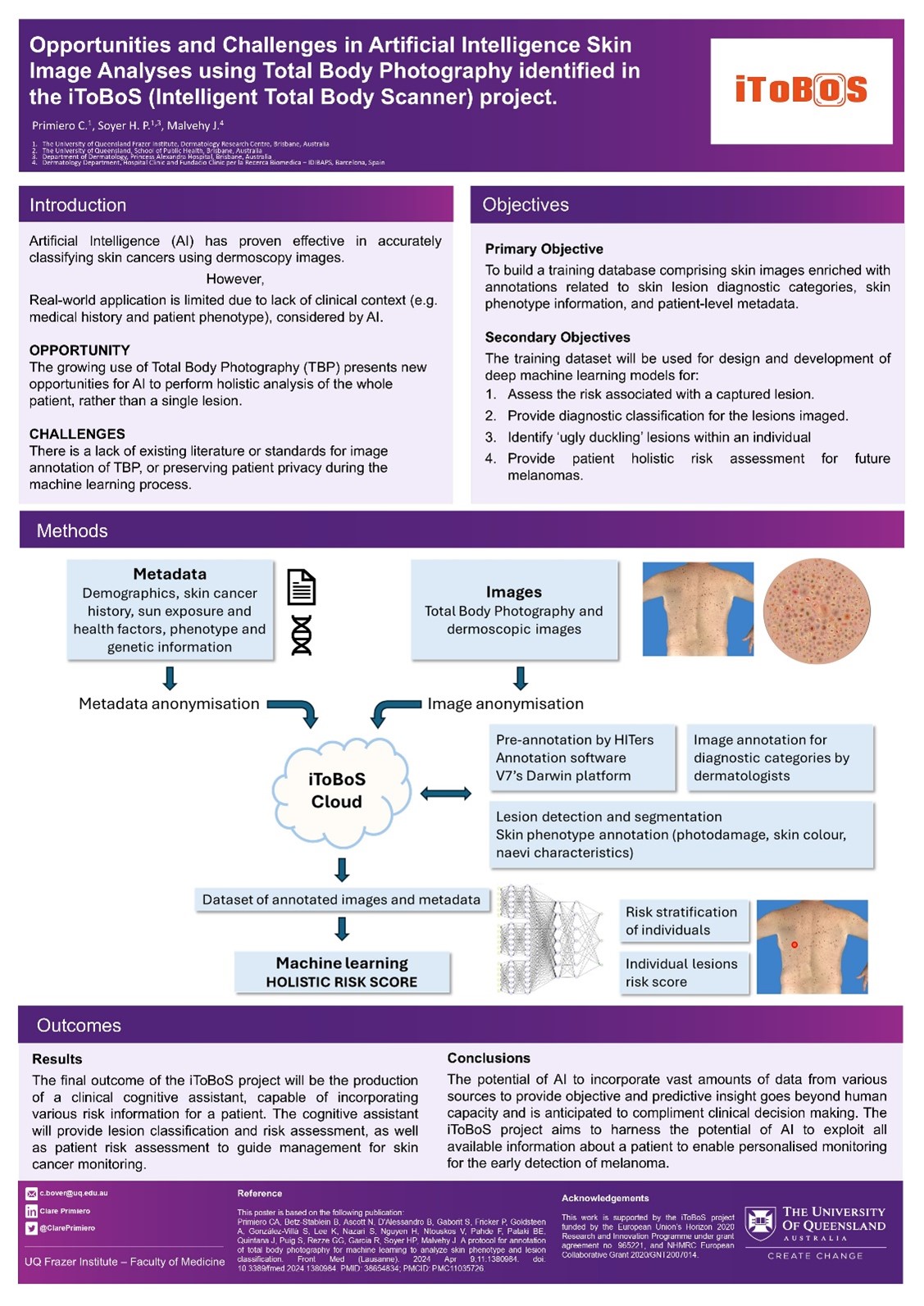 Dr Clare Primiero from The University of Queensland presented a poster which promoted the clinical research undertaken in iToBoS. The poster was titled ‘Opportunities and Challenges in Artificial Intelligence Skin Image Analyses using Total Body Photography identified in the iToBoS (Intelligent Total Body Scanner) project.’ The inclusion of this poster increased visibility of the important work iToBoS is driving, and engaged discussions with field experts, driving future collaborative connections.