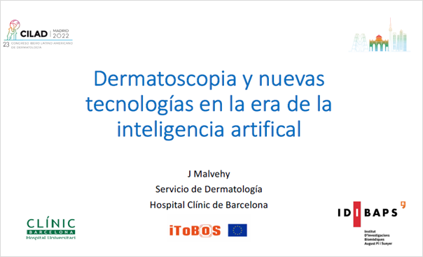 iToBoS was presented by Dr. Josep Malvehy, member of Fundació Clínic per a la Recerca Biomèdica and scientifc partner of iToBoS project with the conference “Dermatoscopia y nuevas tecnologías en la era de la inteligencia artificial” (Dermatoscopy and new technologies in the era of artificial intelligence). The work highlighted the importance of new technologies, such as artificial intelligence, in dermatoscopy and healthcare applied to the skin.